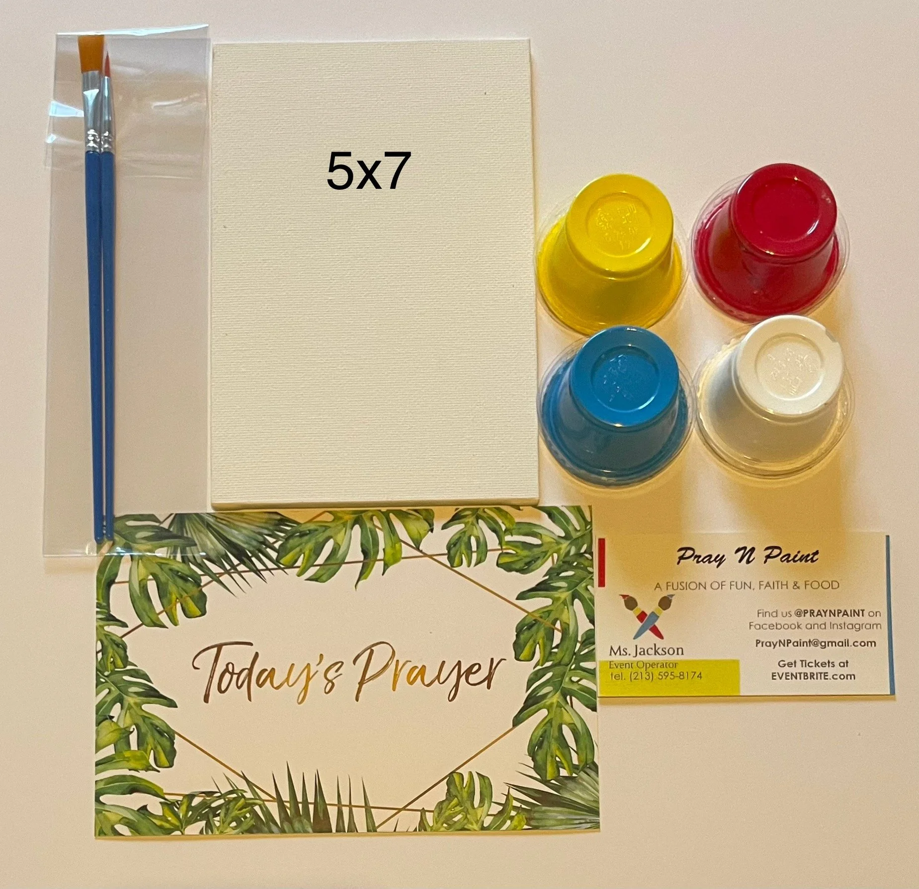 Paint Kit Includes: 1- 5”x 7” Blank Canvas, 2 -Paint Brushes, 4-Paint Colors, 1-Prayer Card, 1 Business Card