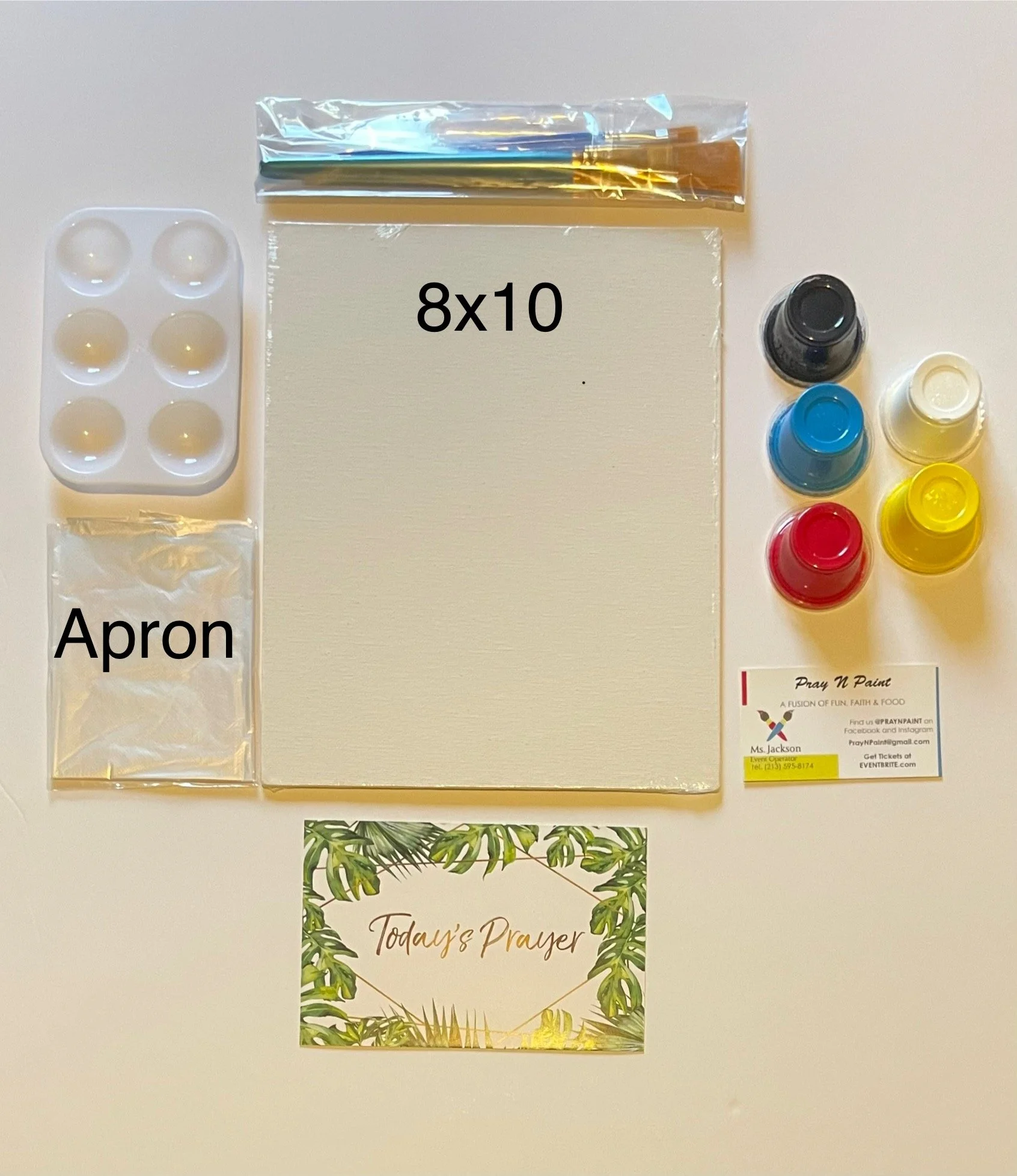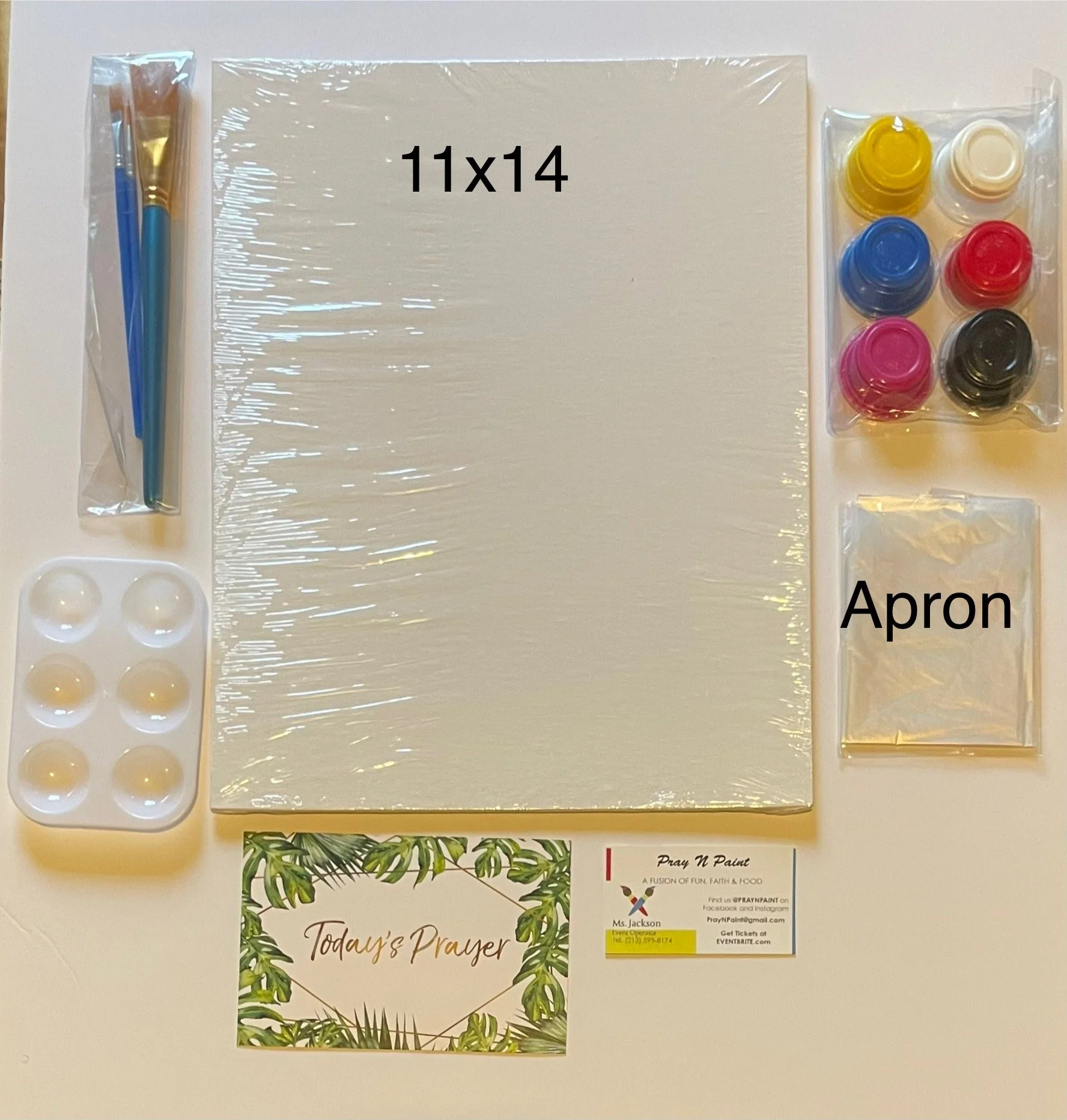 Paint Kit Includes: 1- 8”x 10” Blank Canvas, 3-Paint Brushes, 5-Paint Colors, 1-Paint Palette, 1- Plastic Apron, 1-Prayer Card, 1 Business Card